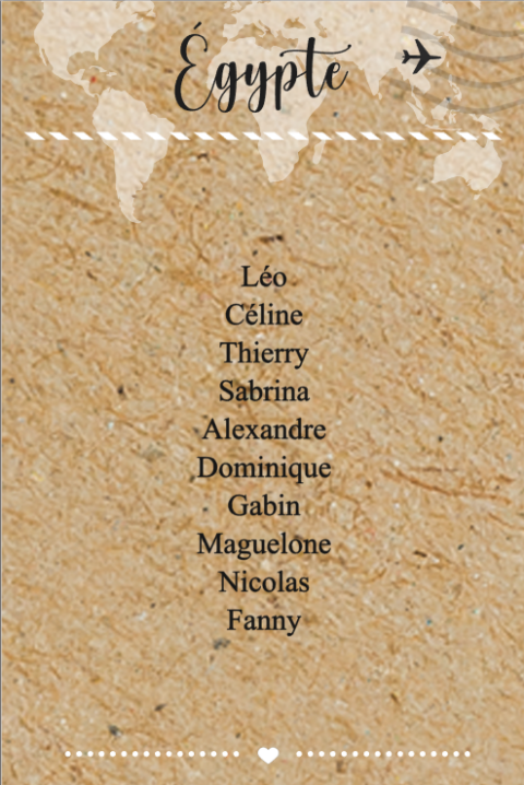 Un carton sur le thème du voyage avec un fond kraft tramé et détails blancs et noirs.
