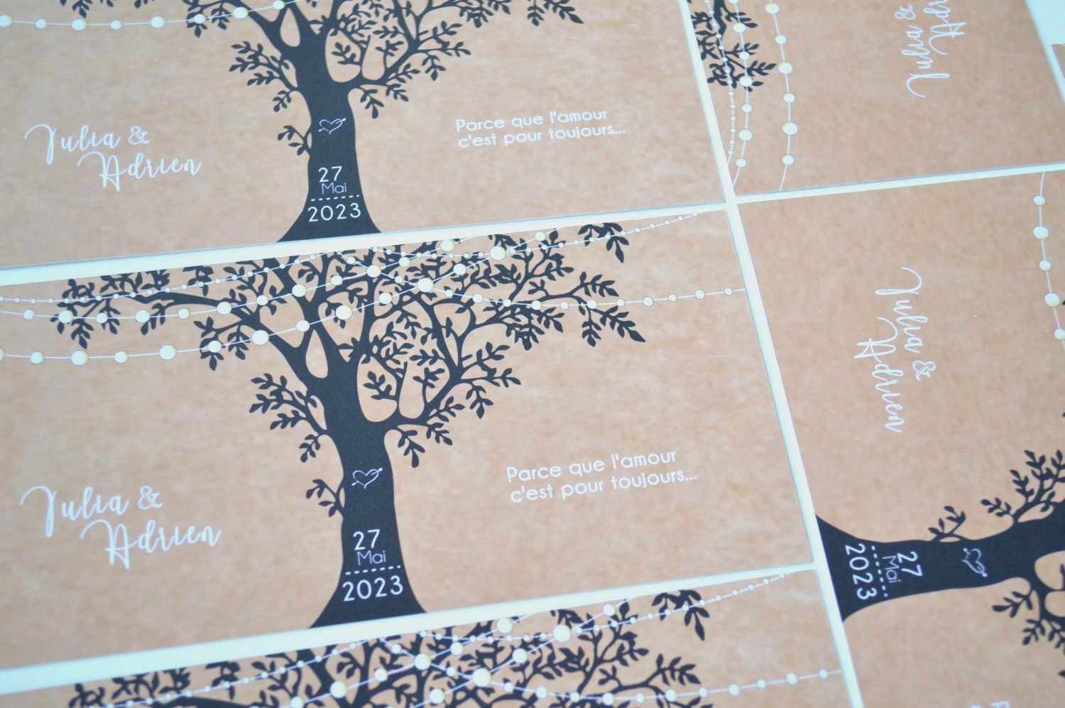- Personnalisation : les prénoms des mariés et la date du mariage sont imprimés au recto, le texte au verso